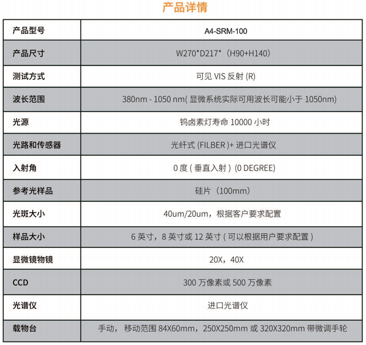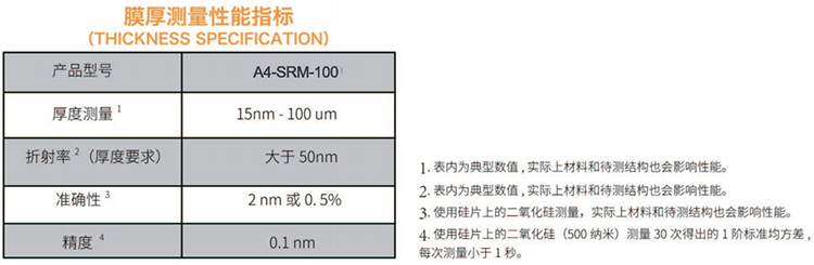 A4-SRM系列反射式膜厚测量仪可用于测量半导体镀膜等需要在很小的面积上测量膜厚的场合。通常面积可小于50um或20um。半导体需要测量silicon nitride,photoresist, polysilicon,oxide等在硅上的膜厚或silicon nitride和oxide等多层膜的厚度。我公司针对这一需求,已经推出多款满足国内半导体,半导体封装,平板显示等行业需求的小光斑显微膜厚测量仪,并已在国内多家半导体及相关厂商投入使用。我公司的小光斑显微膜厚测量仪可以配200毫米(8英寸)和300毫米(12英寸)的工作台和CCD摄像头,配有多个物镜,可使用放大倍数较小的物镜进行目标查找,然后再使用较大物镜进行测量。(如图)